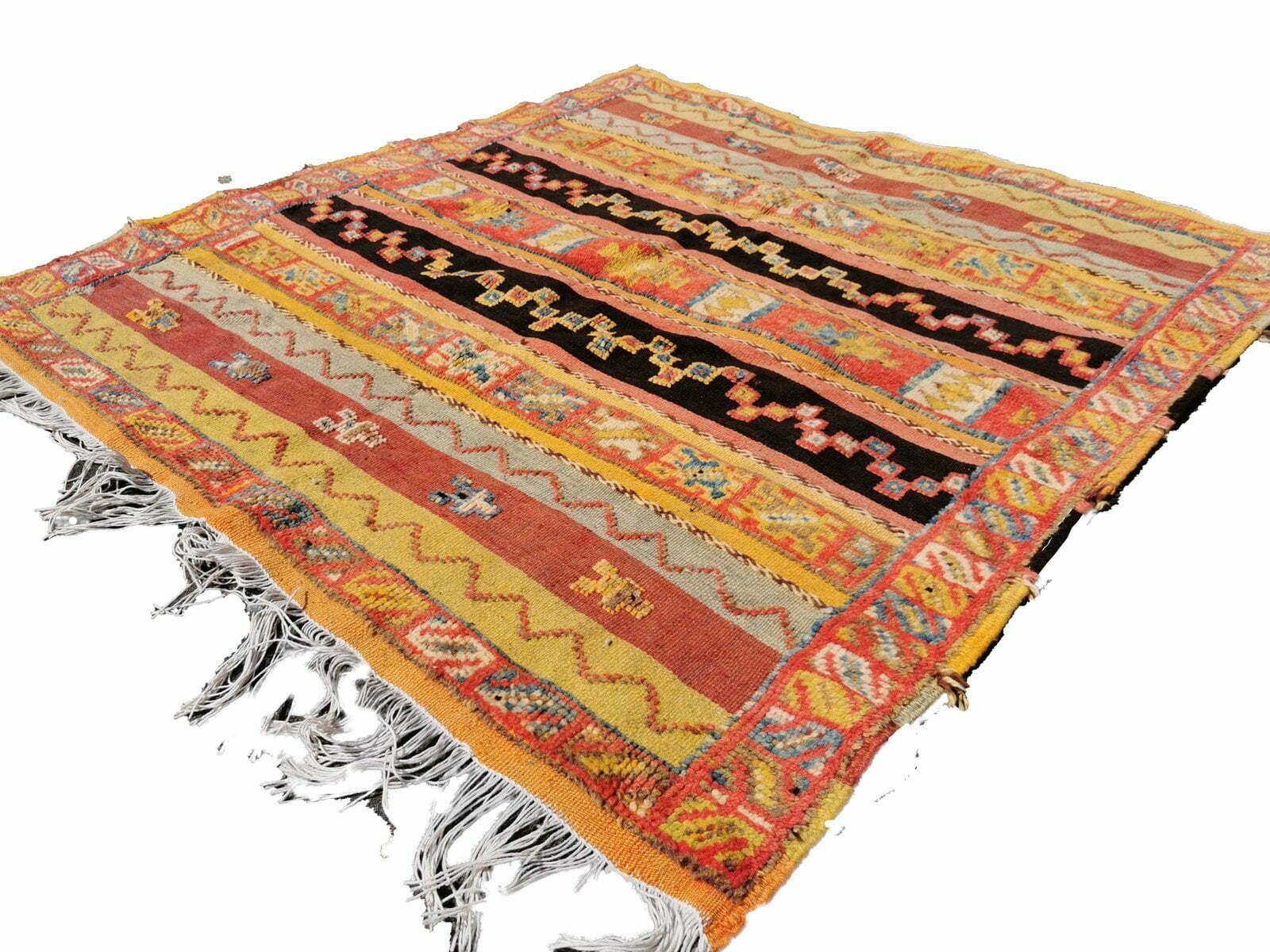 Made from Camel and sheep wool, Glaoui rugs are known and valued by the complexity of their making. In fact, they combine three techniques of weaving: the kilim, knotted stitch and embroidery in relief. Kilim rugs are woven flat; the rendering is soft and lightweight. This technique is different than knotted which gives a velvety and soft mat. These rugs are made entirely by hand by the Berber women in the Ouarzazate region. Wool is dyed with natural dyes only. This rug will fit easily in your home with a touch of warmth and authentic. It can also be used in wall hanging. Shipping worldwide. Feel free to contact me for the shipping costs for your country.